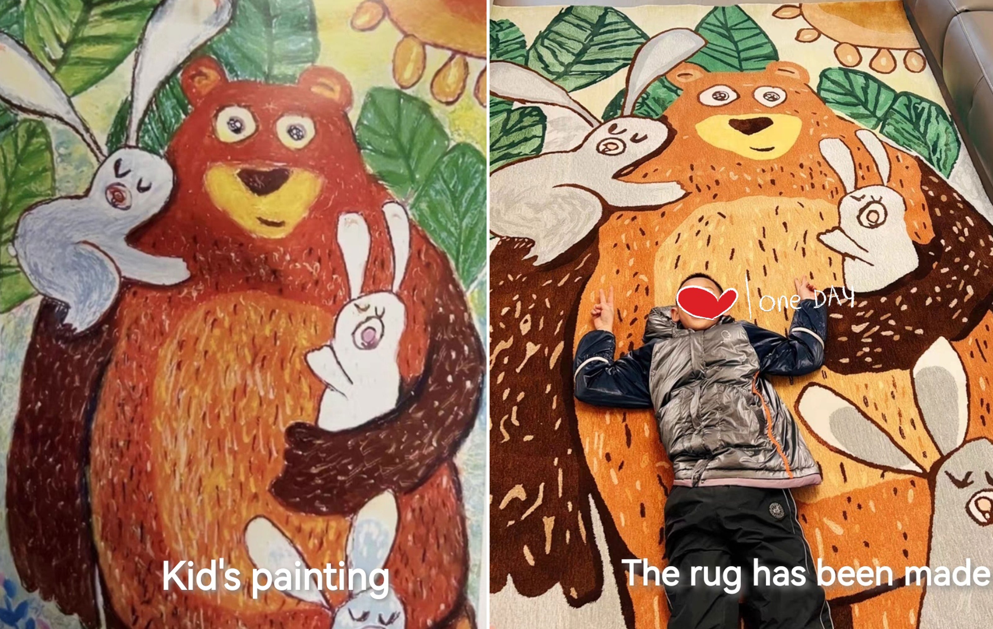 “My son Noah was so proud of his big brown bear drawing. I decided to surprise him by turning it into a giant rug for our living room. I was nervous, but it turned out incredible! The colors are perfect and it's so soft. It's now his favorite place to play and we absolutely love it. Worth every penny!”