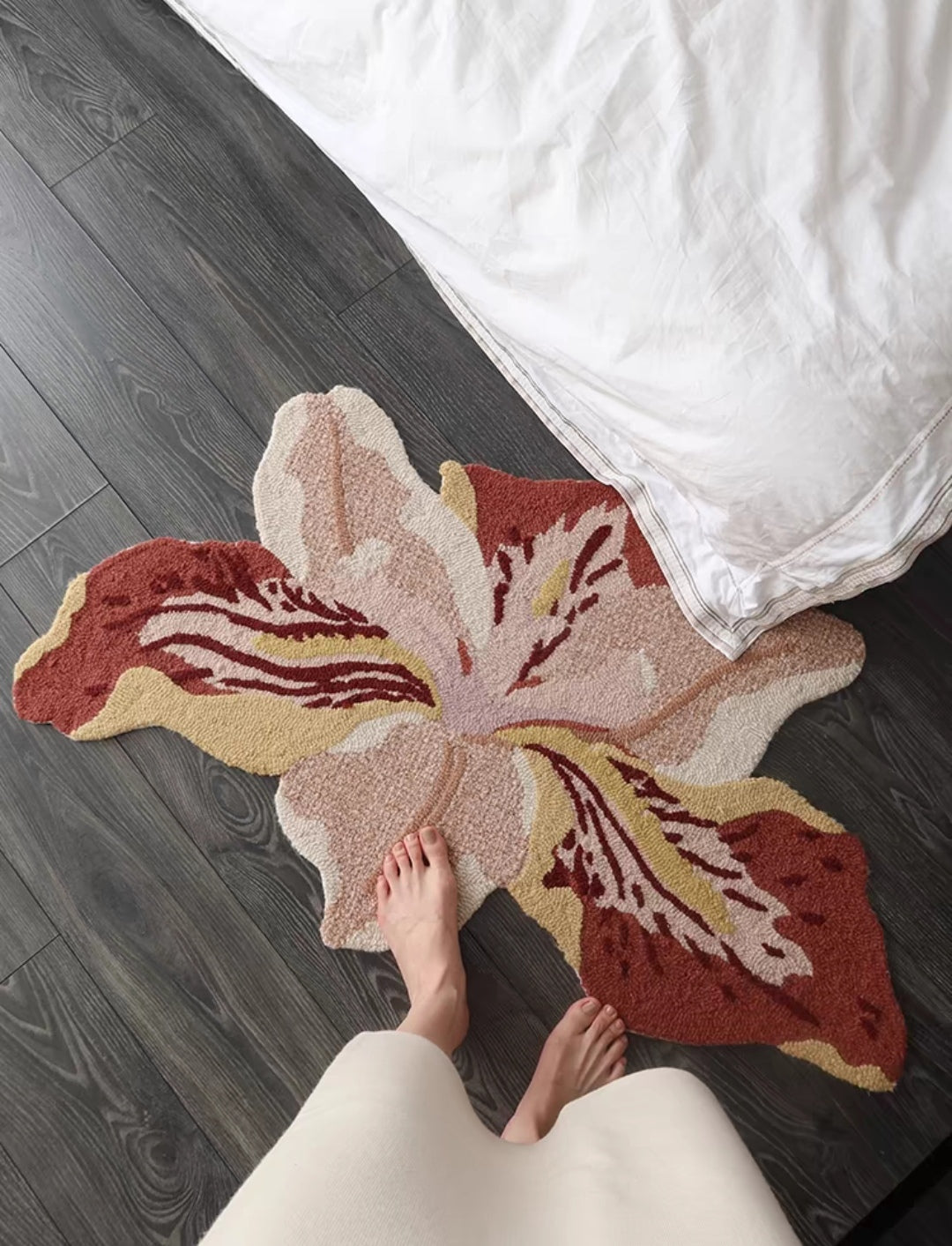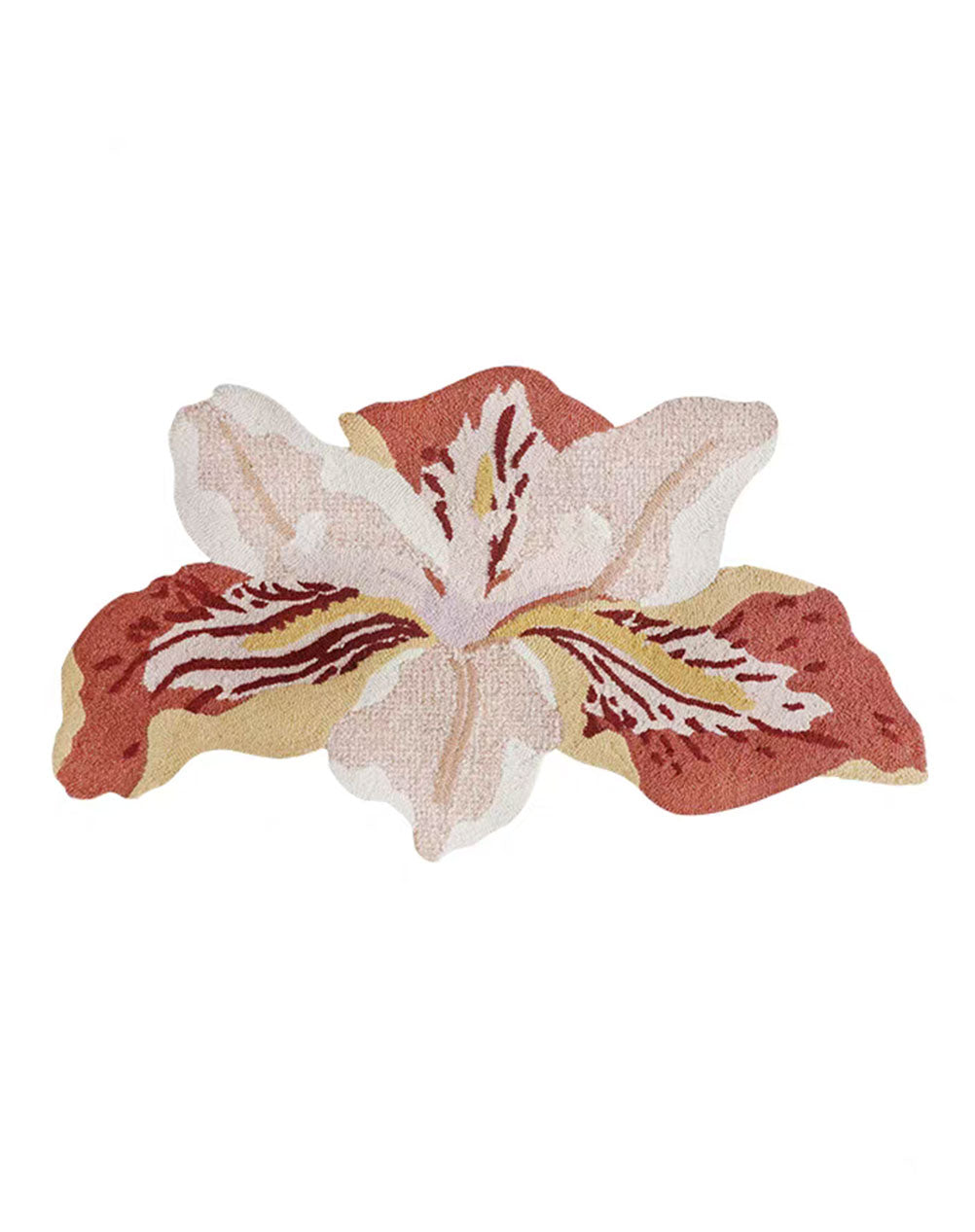 Inspired by Iris germanica's flame-like petals—each tuft dyed with iron oxide pigments for antique depth.
